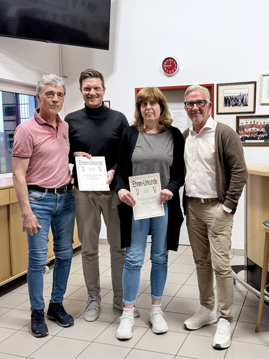 Silberne Ehrennadel an Sandra Schulz und Freddy Buballa durch TuS-Vorsitzenden Frank Sprau und TuS-Vize Peter Germscheid (links). Auf dem Bild fehlen Tristan und Kilian Limbach